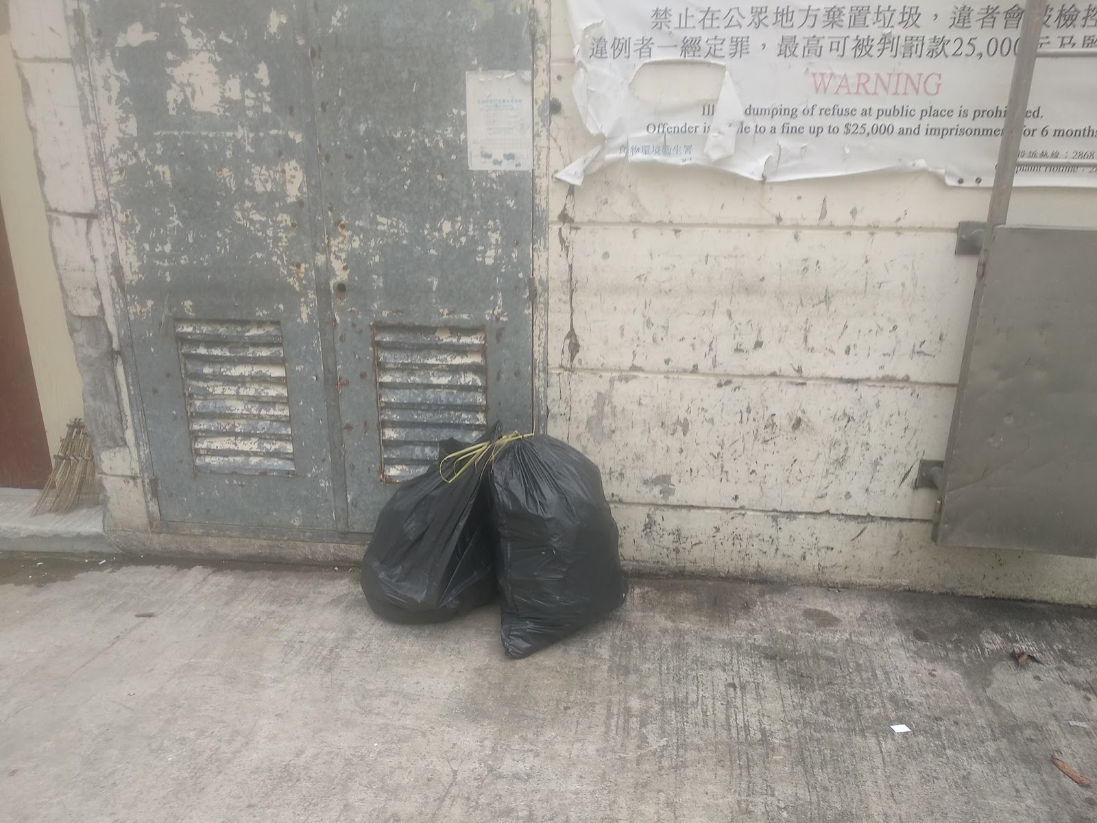 Here are the two bags of discarded bottles, cans, wrappers, shoes, cigarette packs, and facemasks.